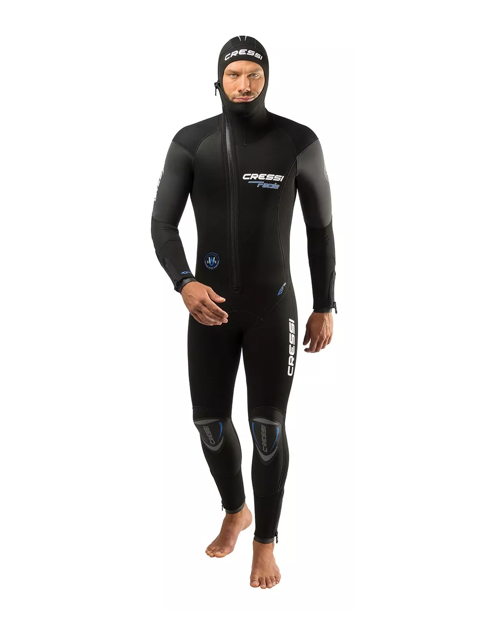 La posibilidad de filtraciones de agua se reduce al mínimo mediante una serie de recursos técnicos, sin necesidad de recurrir al uso de una cremallera estanca. Para limitar la entrada de agua a través de la cremallera principal frontal se utiliza el sistema Cressi WSS® (Water Stop System): una pechera de neopreno de 3 mm, unida al interior del traje. La poca cantidad de agua que inevitablemente entra a través de esta cremallera, no llega al cuerpo del buceador, como sucede normalmente, sino que se almacena en la cara interna del mono integral y la pechera, la cual a su vez dispone de una fina cremallera no coincidente con la cremallera principal. Esta pechera, aparte de mejorar la estanqueidad, incrementa la memoria térmica del neopreno en la sensible zona del tórax. Esta exclusiva solución hace al monopieza integral Facile HF más térmico que cualquier otra combinación similar del mercado.